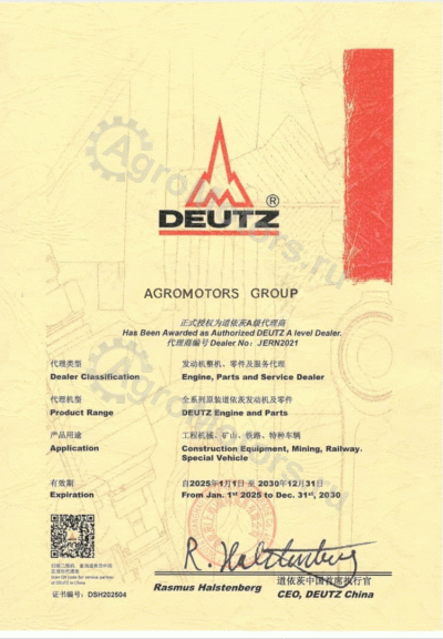 Наша компания как официальный импортер новых оригинальных немецких и китайских двигателей Deutz на территории РФ продает их с гарантией завода 1 год (либо 500 м/ч). Возможно предоставление расширенной гарантии, не включающей ограничений наработки. Все двигатели представленные у нас прошли должную сертификацию и соответствую необходимым техническим регламентам.